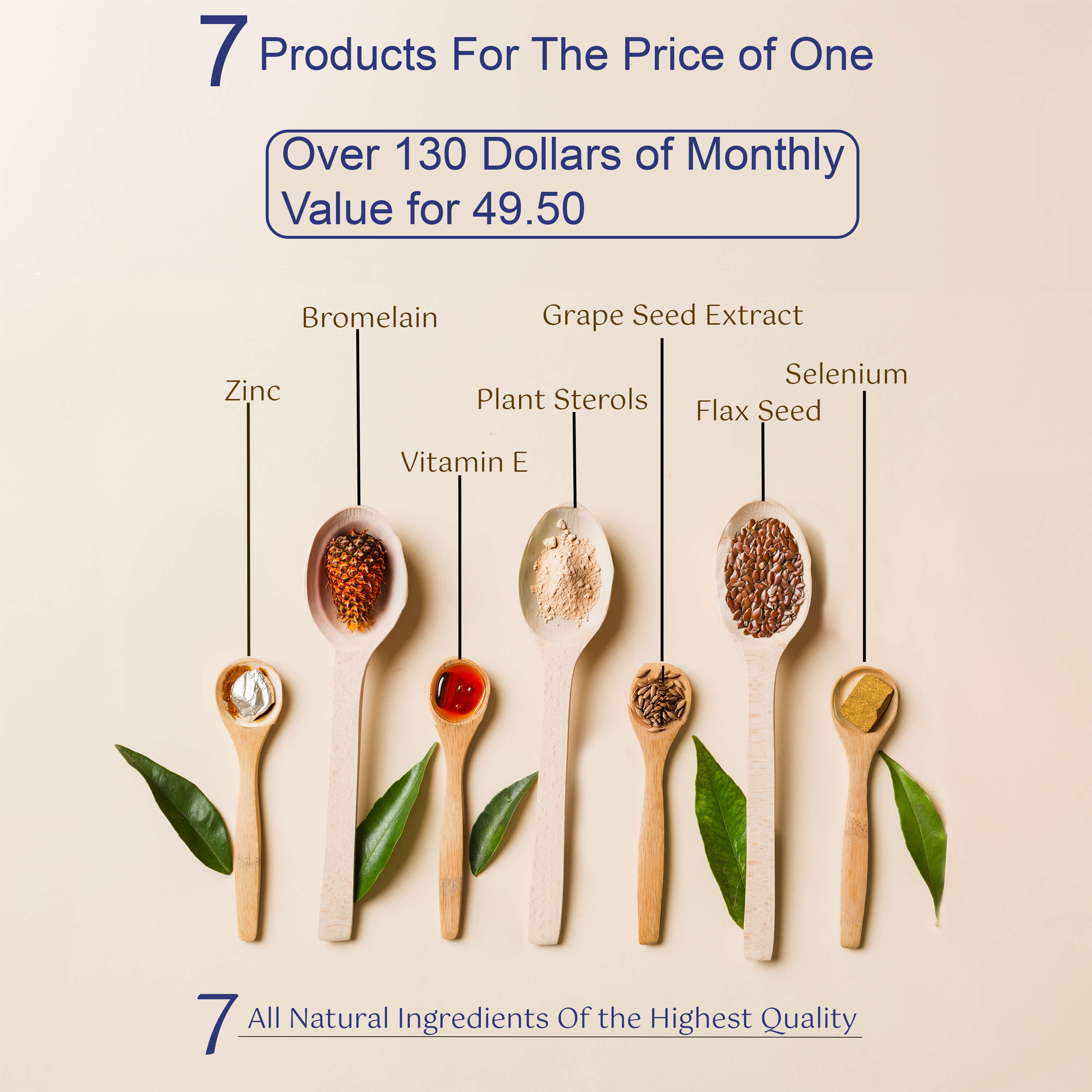 Sterochol Probiotic, Plant Sterols, Ashwagandha.  Immuno-care zinc, vitamin e, selenium, flax seed, grape seed extract, bromelain.